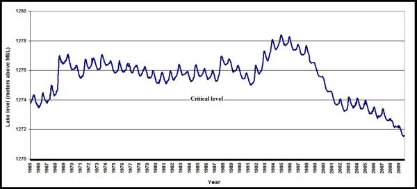 More than seven million people are living in two neighboring provinces around the lake, and agriculture, horticulture, animal husbandry, handicraft making, apiculture, mining, business, and industry play a major role in the region (Delju et al 2013). The basin itself has include a population of about 4.6 million in itself. The lake basin, as a socio-ecological region, faced extreme water shortages in the recent years due to water overuse and climate change (Alipour 2006, Zarghami 2011). Because of the intense agricultural development and rapid urbanization, the groundwater level in some parts of the basin has decreased by up to 16 meters. The water level of the lake and area are now below the critical level (Figure 2). The lake requires a minimum inflow of 3.1 billion cubic meters per year to compensate for evaporation, otherwise the wind-blown salty dusts will threaten the health of people in the area.