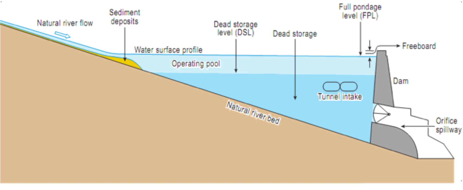 A generic schematic showing the side view of a typical dam with low-level outlets.