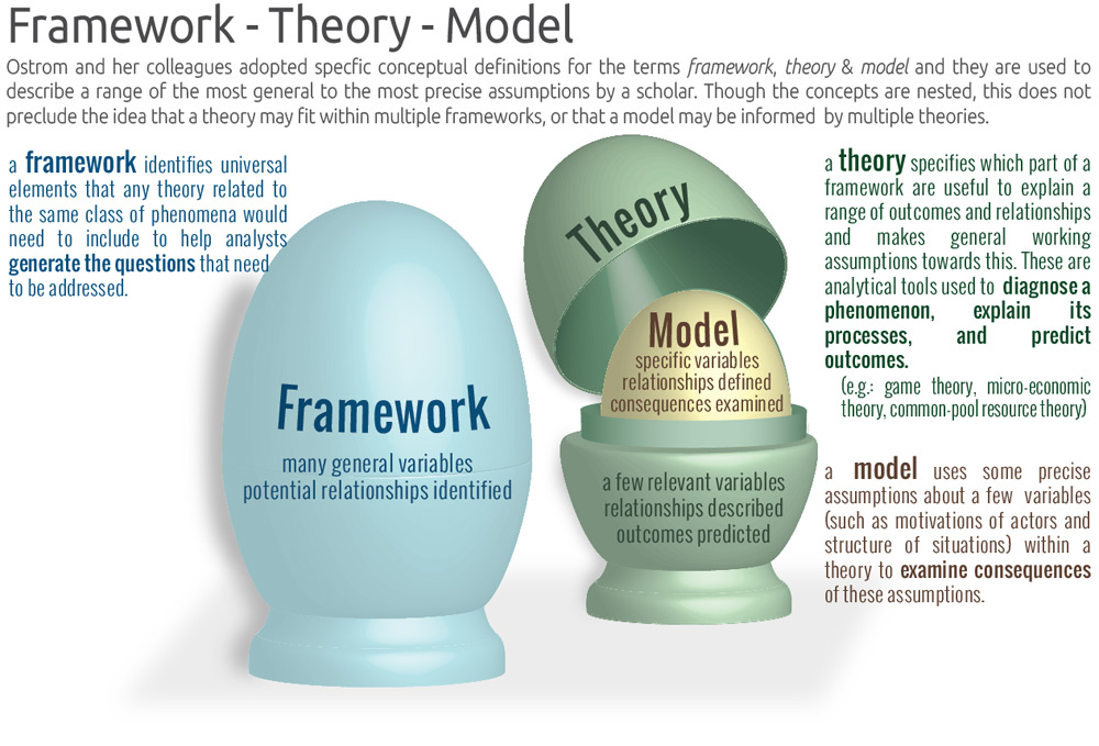 A common challenge when working in an interdisciplinary setting is that academic disciplines have their own vocabulary, and there are many words with specific meaning in one setting, and different implications in another. In the context of the Ostrom Workshop, framework describes the most general set of variables and broadest assumptions when examining a setting (made of one or more systems). Frameworks provide a way for an analyst to describe the parts of this setting and what general interactions and relationships may exist. A framework can inform an analyst’s evaluation of parts as the analyst learns more about how the parts relate to each other. A framework does not assume the nature of relationships and is not prescriptive. Further refinement, additional details and assumptions about the nature of relationships and variables, moves into the territory of theories, and as a specific theory is refined to include predictive assumptions, analysts may construct models that make more precise assumptions to examine the application of a theory to specific situations, outcomes, and structures.