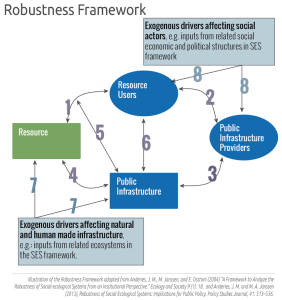 While the SES Framework can be used to parse an SES to identify component elements, their characteristics and interactions between elements, it doesn’t provide a systematic way to study the feedbacks and dynamics within the SES. The Robustness Framework grew out of the question “what makes social-ecological systems robust?” This question itself is somewhat loaded — robust in respects to what types of system shocks? how do we identify the cost-benefit trade-offs in evaluating robustness of a particular system for these types of shocks? how do we define the system and the characteristics that should be maintained? How does the collapse of a system component (such as a single fishery within a larger system of resources, infrastructure, and relevant actors) relate to the robustness of the total system and its other social and resource components? How do we design for robustness?