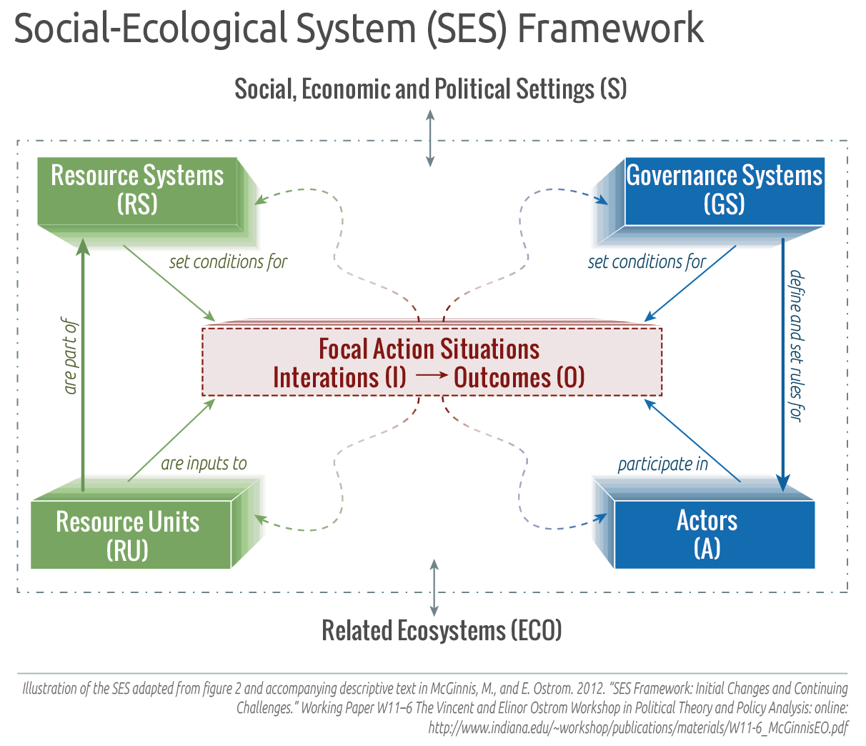 - McGinnis, M., and E. Ostrom. 2012. ““SES Framework: Initial Changes and Continuing Challenges.” Working Paper W11–6 The Vincent and Elinor Ostrom Workshop in Political Theory and Policy Analysis: online: http://www.indiana.edu/~workshop/publications/materials/W11-6_McGinnisEO.pdf