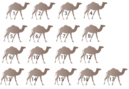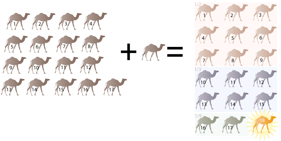 The brothers were puzzled, but pleased to have an additional camel, and began to walk home. On the long walk home, they calculated how a herd of 18 camels might be divided. Half, or nine, would go to the oldest, the middle would get a third (six), and after the youngest received his ninth (two), there was still one more camel.